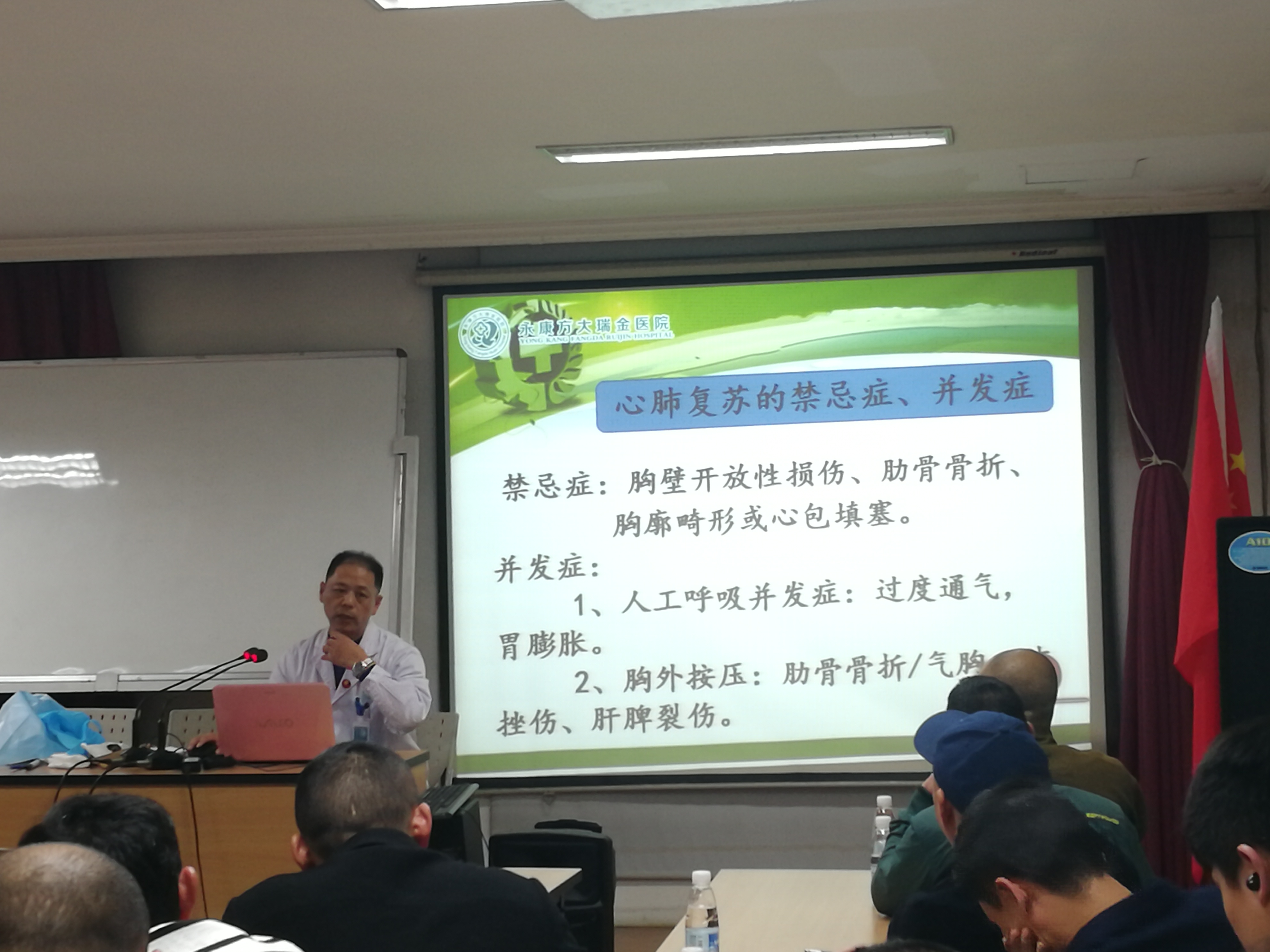 在培训现场,各位医生采用理论知识和实际相结合的方式,对我们讲解生活和工作中常见的突发疾病和意外伤害的处理方法,如骨折包扎、止血、心肺复苏等。其中心肺复苏更是重中之重,霍主任先是通过PPT图文并茂的对整个过程进行了详细讲解,再利用人体模型在现场演示了如何处理口腔异物、心脏按压和吹气的全过程,一边讲解操作方法和动作技巧并指出易犯错误的点,员工们看的非常仔细。